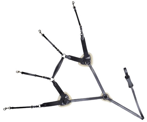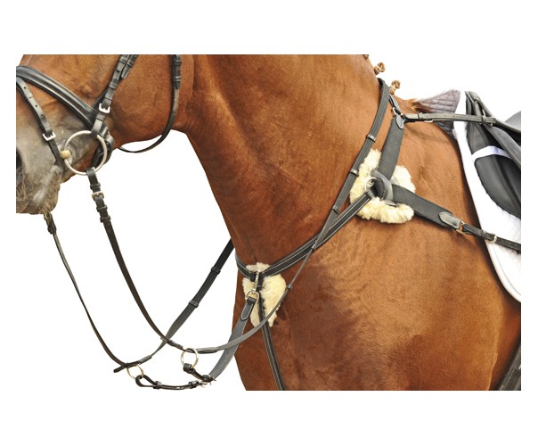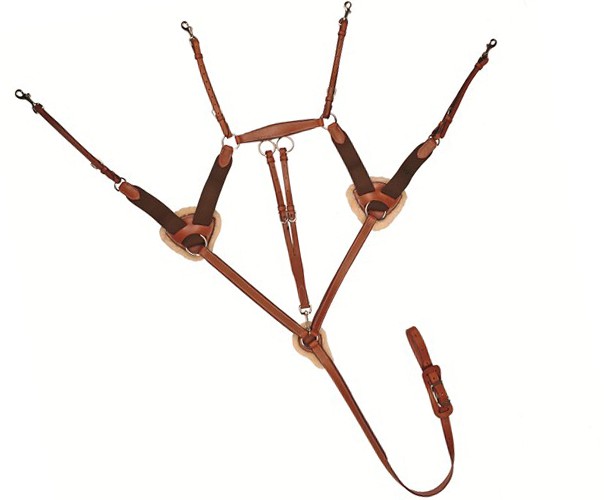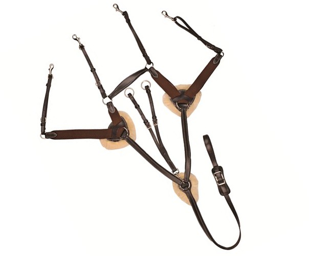 Moderní pětibodový kožený poprsník od HKM z kvalitní anglické kůže. Fixuje sedlo na koni v pěti bodech. S možností nastavení velikosti přezkami, místo křížení a připnutí martingalu je podložené pravým beránkem, který je připevněn pomocí suchých zipů. Elastické díly pro maximální komfort koně. Výborná kvalita za výbornou cenu.