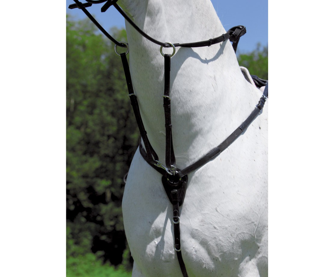 Kvalitní kombinovaný poprsák s martingalem s elastickou částí a odepínací martingalovou vidlicí. Martingalová vidlice je velikostně dobře stavitelná, a dá se celá z poprsáku odepnout. Poprsák má elastickou část, je velikostně stavitelný na části pro zapnutí k sedlu i k podbřišníku. Zapínání k sedlu ja na karabinky. Na spodní části má poprsák navíc našité 2 kovové očka pro možnost přichycení pomocných otěží. Je vyroben z kvalitní kůže, kování v chromové barvě.