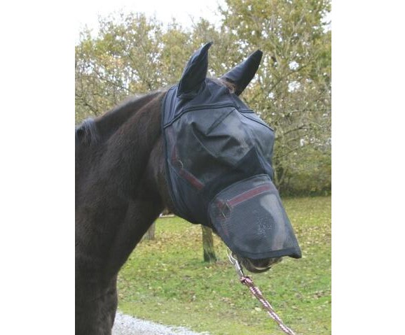 Maska proti hmyzu, která chrání také nos a uši koně. Všechny okraje jsou obšity fleecem, který zabraňuje odírání kůže. Zapíná se pod hrdlem na suchý zip.