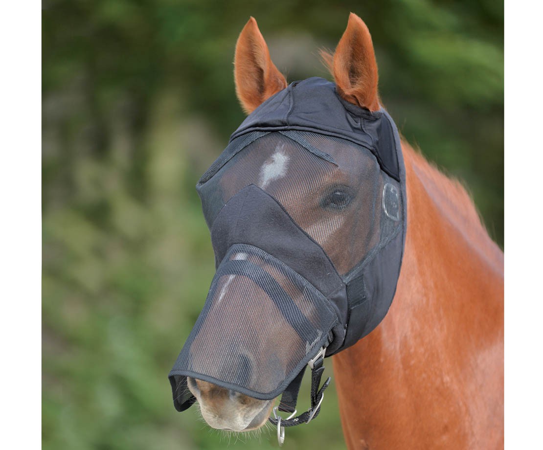 Kvalitní maska pro ochranu očí i nozder. Maska s otvory pro uši a suchými zipy pro snadné upevnění na hlavu. Maska se dá dobře utáhnout, dokáže koni poskytnout skvělou ochranu očí před dotěrným hmyzem. Lehká umělohmotná tkanina je stabilní a velmi trvanlivá. Vypodloženo fleecem. Maska má mezi ušima otvor pro protažení kštice.