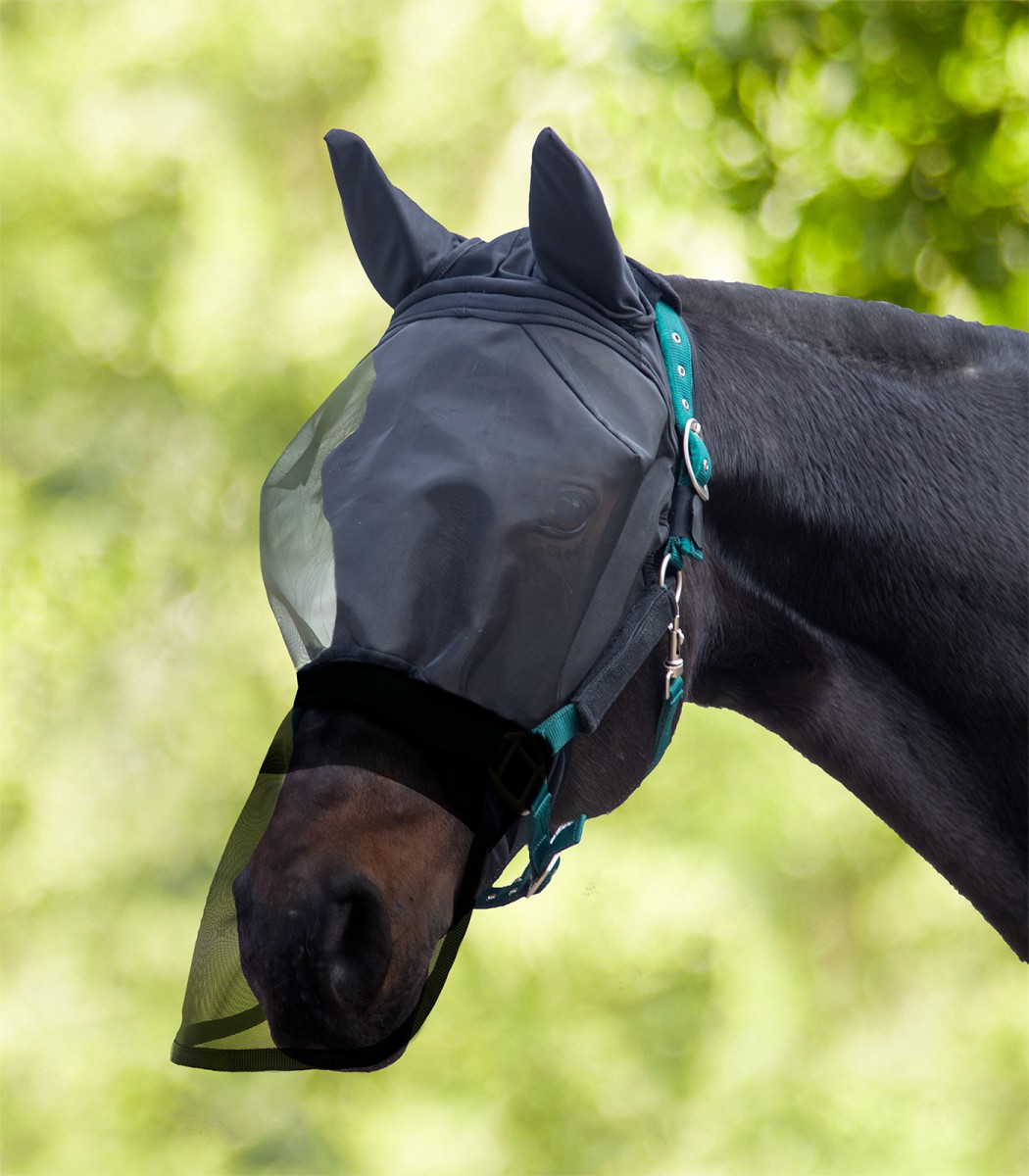 Oblast uší je ušitá z měkkého materiálu. Kolem očí extra prostor. Maska se připevňuje k ohlávce pomocí cuchého zipu. Nosní díl je nastavitelný.