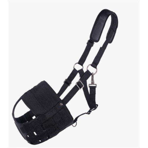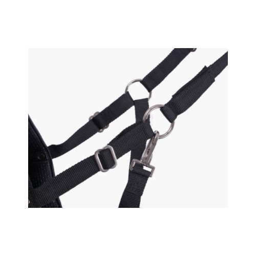 Praktická ohlávka včetně náhubku pro koně značky QHP v černé barvě. Náhubek má po stranách velké otvory pro nozdry, což zajišťuje stálý přísun čerstvého vzduchu pro Vašeho koně. Ohlávka je nylonová se tříbrnými kovovými přezkami. Zapínání na silnou karabinu. Na nátylníku je měkké pohyblivé vypodložení s navléknutím na gumu. Náhubek je po obvodu měkce polstrovaný. K dispozici od velikosti shetty až po velikost full.