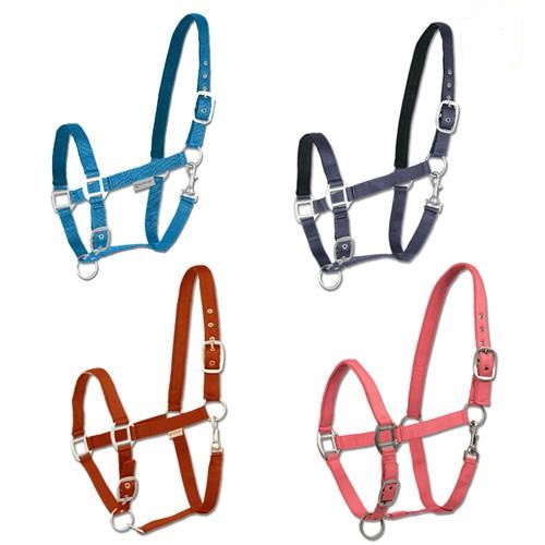 Nylonová ohlávka pro koně, 2x podložená neoprenem, 2x stavitelná pomocí přezky– nánosník a nátylník včetně otočné karabiny.