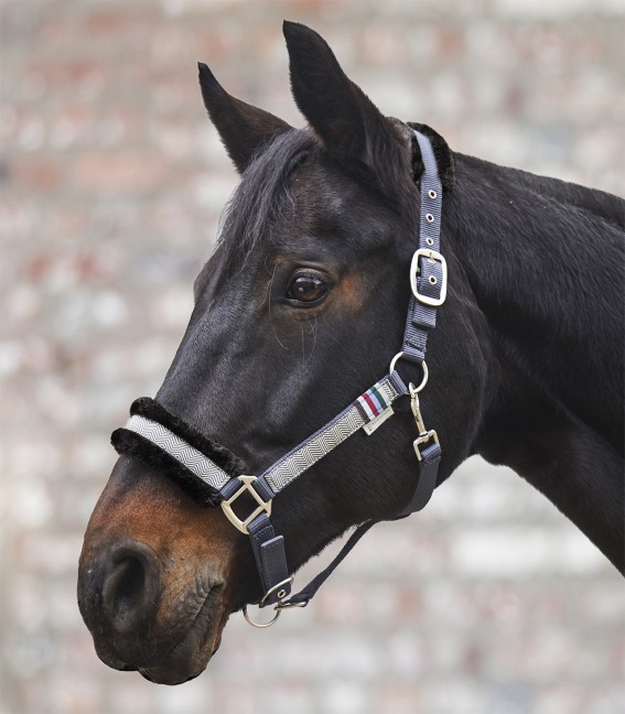 Módní ohlávka, Matné kování. Měkká syntetická kožešinová výplň na hlavě a nánosníku. Vícenásobná nastavitelnost.