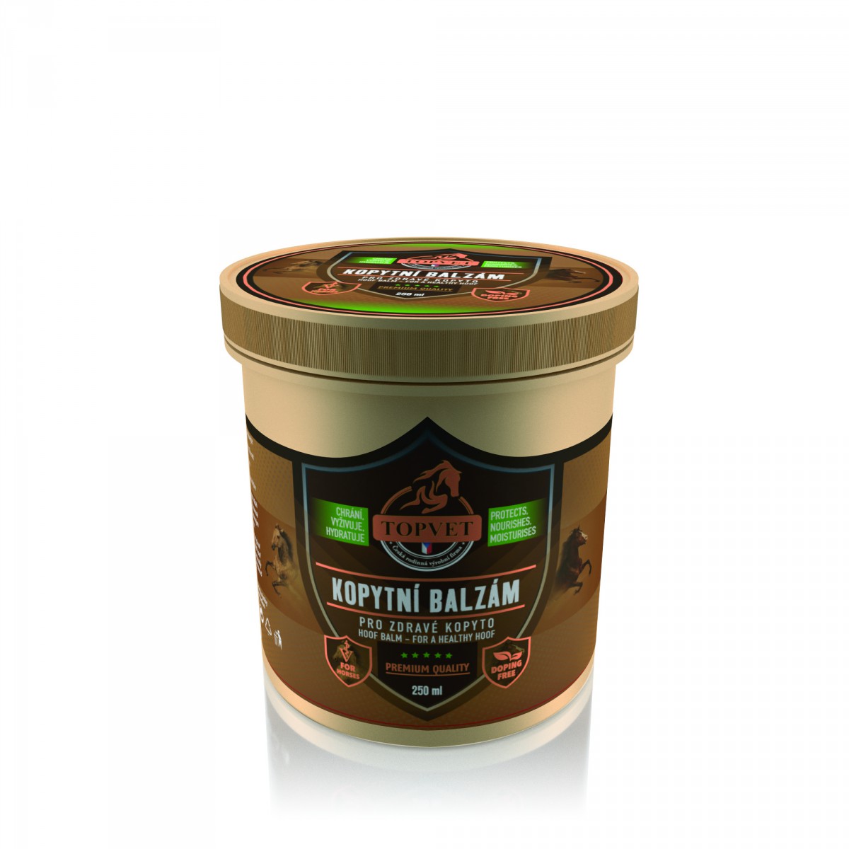 Balzám na kopyta je určený pro koně se zdravým a nepoškozeným kopytem. Originální receptura kopytní tkáň vyživuje, hydratuje a chrání před agresivním prostředím. Kopyto je po použití zdravé, elastické a připravené na vysokou zátěž. Směs luxusních olejů díky vysokému obsahu nenasycených mastných kyselin přirozeným způsobem vyživuje a regeneruje. Směs vosků kopyto chrání. Bylinná směs dodá kopytu lesk a barvu.
