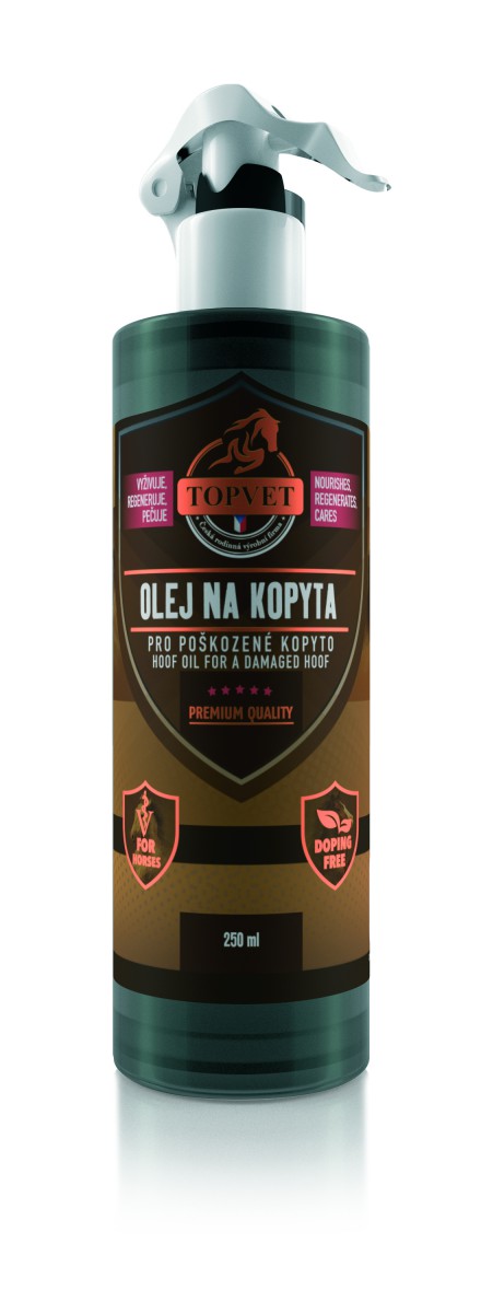 Olej na kopyta je určený pro koně s poškozeným kopytem. Originální receptura kopytní tkáň vyživuje, hojí a regeneruje. Kopyto je po použití zdravé, elastické a připravené na vysokou zátěž. Směs luxusních olejů díky vysokému obsahu nenasycených mastných kyselin přirozeným způsobem vyživuje a regeneruje. Směs vosků kopyto chrání. Směs silic vykazuje silný antiseptický a hojivý účinek.