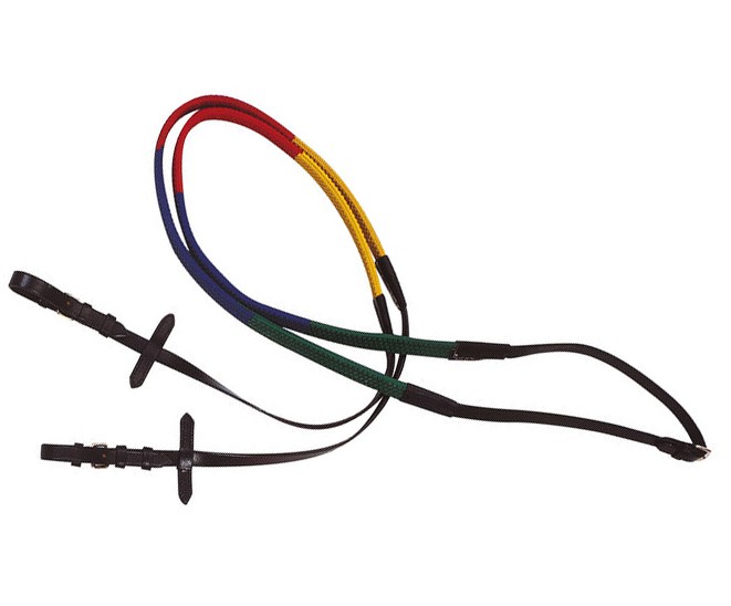 Otěže z buvolí kůže, pogumované. Čtyři barevně odlišené úseky pomáhají začátečníkům správně odhadnout délku otěží.