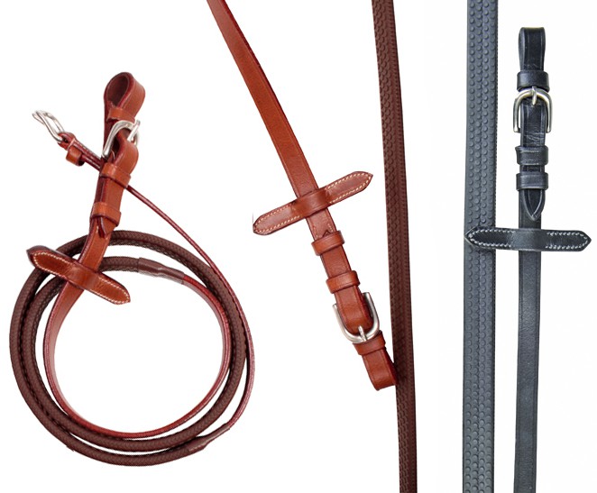 Pogumované otěže kombinované s kůží. Při výrobě otěží byla použitá kvalitní kůže a kování. Jde o klasickou gumovou otěž s "velkými puclíky."