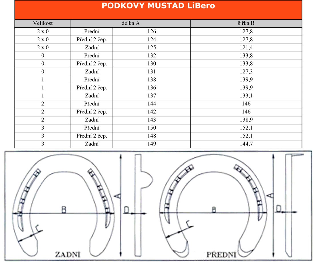 Podkova Mustad LiBero je klasická ¾ rýhovaná podkova vycházející z velmi oblíbené řady podkov modelu LB. Tato podkova představuje vyšší verzi základní řady podkov se širokou nabídkou velikostí a rozměrů, která je vhodná pro použití u většiny koní a disciplín.