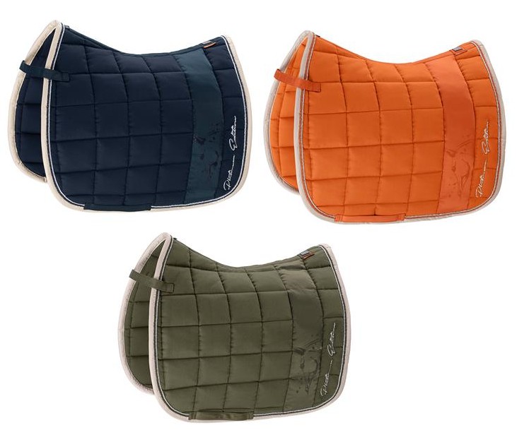 Rychleschnoucí prodyšný materiál, poutka k sedlu a na podbřišník, kontrastní barevný lem, čtvercové prošívání, stříbrné logo.
