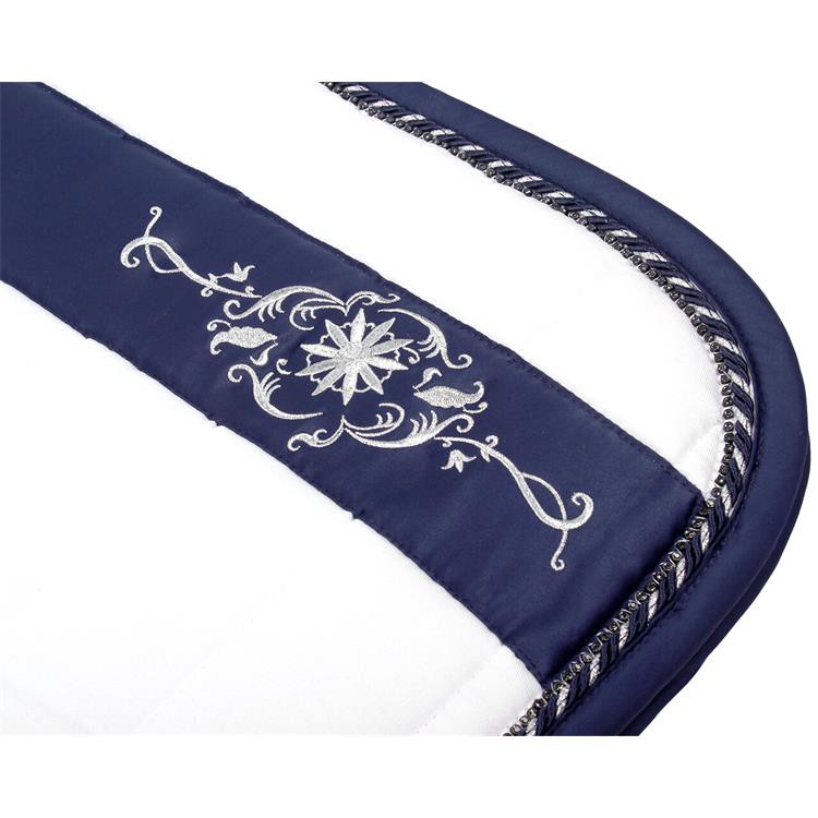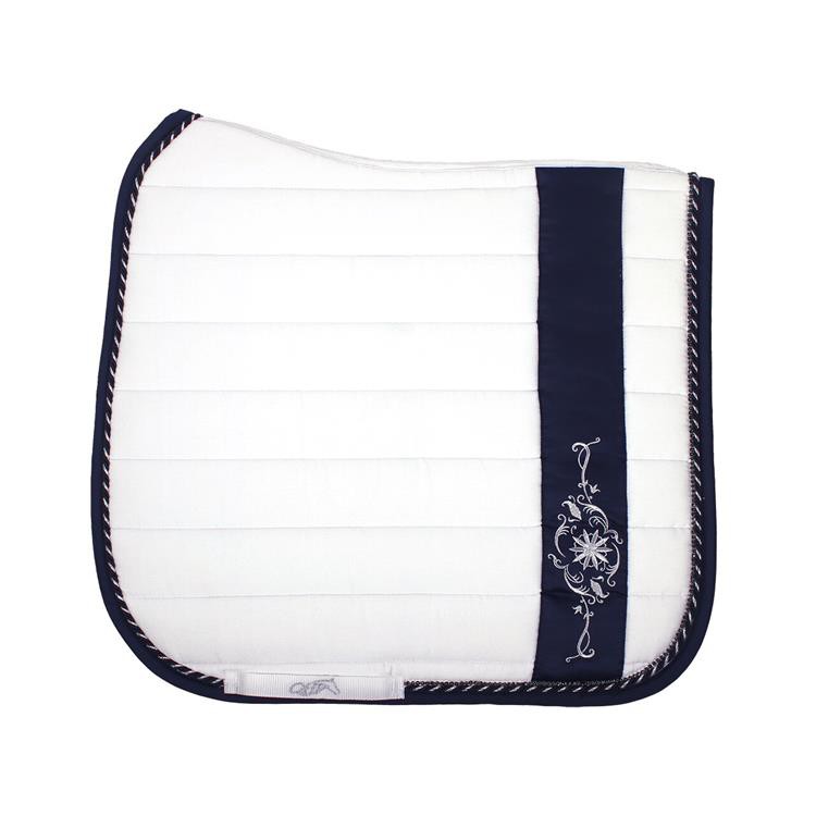 Kvalitní podsedlová dečka značky QHP v pony a full velikosti. Dečka amá atraktivní vodorovné prošívání. Je v bílé barvě doplněná kontrastní modrou. Na modrém pruhu jsou vyšité květinové ornamenty. Lem je zdobený kroucenou šnůrkou též v kontrastní tmavě modré barvě. Podél lemu v zadní části je zdobení tmavými kamínky. Dečka má poutka na podbřišník. Je vyrobena z kvalitního prodyšného materiálu.
