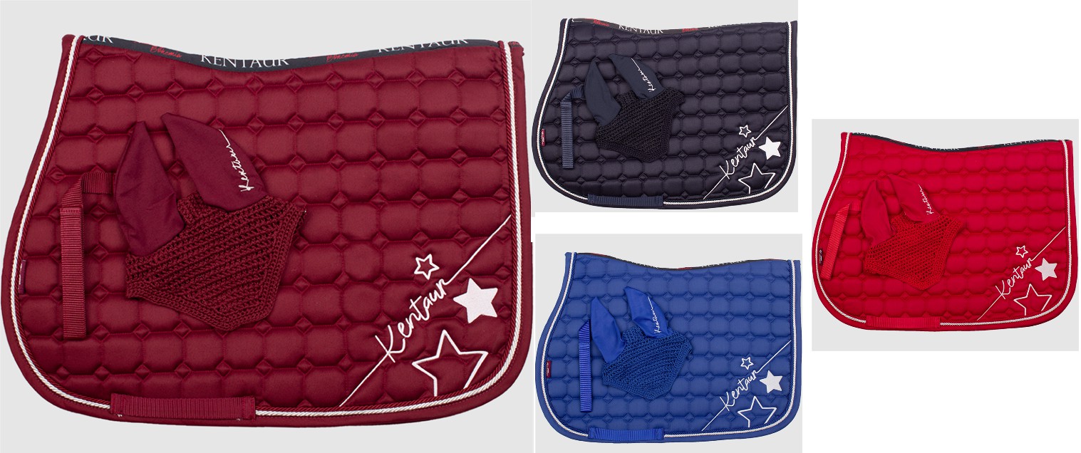 Kvalitní set podsedlové dečky a čabraky v různých barvách. Podsedlová dečka je vyrobena z kvalitního prodyšného materiálu. Je zdobena lemem v kontrastních barvách a logem s motivy hvězdiček. Dečka má atraktivní prošívání, poutka k sedlu a na podbřišník. Čabraka je také s logem Kentaur, má jemné elastické uši.