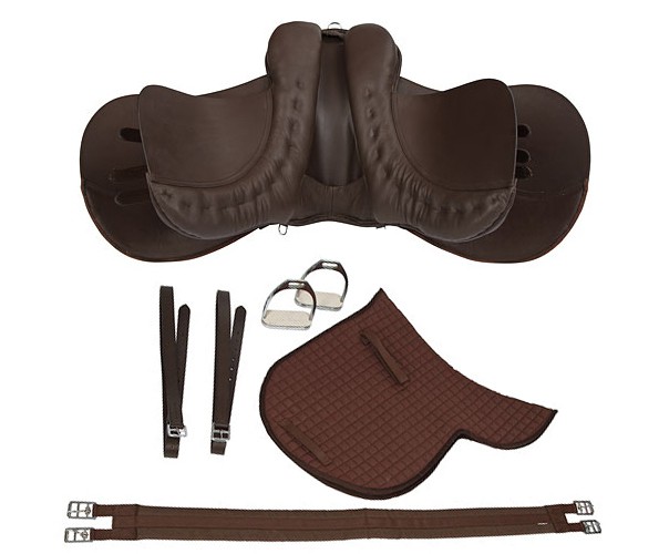 Cenově výhodné kožené univerzální sedlo Kerbl dodávané včetně příslušenství: vykrojená dečka, kožené třmenové řemeny, niklované třmeny s bílou gumou a podbřišník.