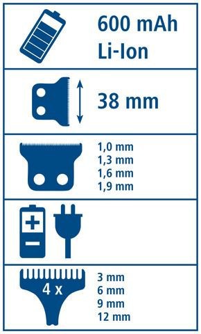 - 4 plastové nástavce pro délku střihu - 3, 6, 9, 12 mm