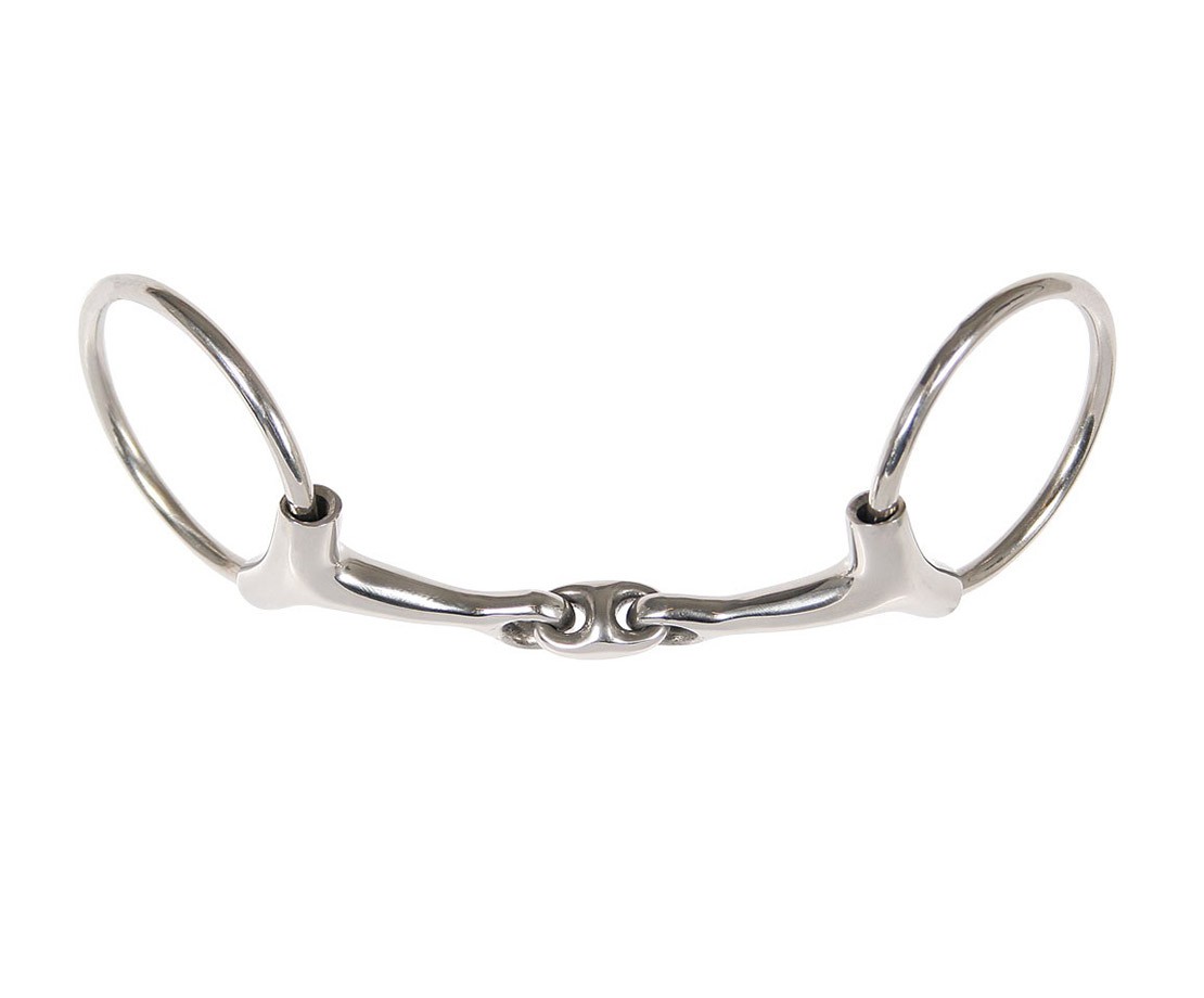 Novinka, anatomicky tvarovaná 2 x lomená oliva s možností otáčení kroužků. Udidlo je vhodné pro všechny tvrdší koně a koně, které je třeba přimět vnímat udidlo a zlepšit tak nebo přivodit přilnutí koně. Nedráždí koutky huby a díky zcela otočným kroužkům si dokážete jemně pohrávat s jeho hubou, díky dvojitému lomení bez tlaku na jazyk a patro koně. Tloušťka udidla je 14 mm, průměr kroužků 5,5 cm.