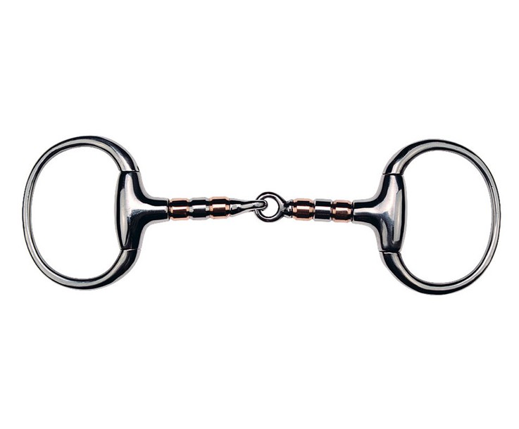 Olivové udidlo s měděnými válečky, které nedávají koni pevný bod v hubě a působí proti ,,zakousnutí se" do udidla.