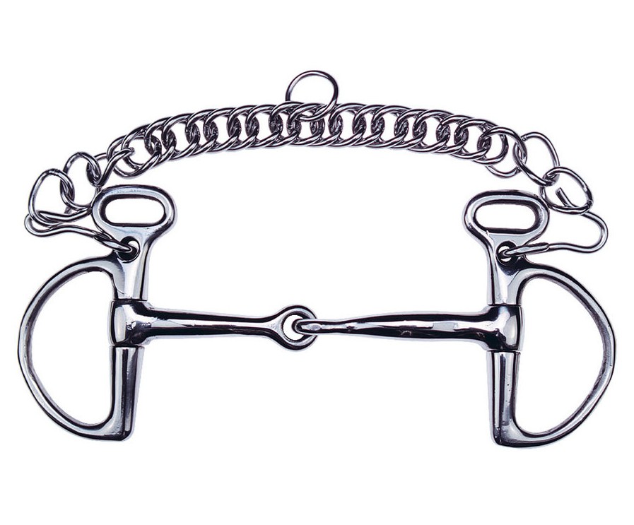 Ostřejší nerez skokové udidlo typu Thiedelman s plným lomeným udítkem. Možnost regulace ostrosti silou podepnutí řetízku. Podpínací řetízek je součástí dodávky.