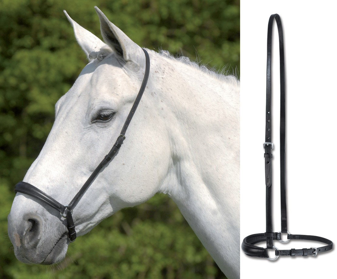 Kožený hannoverský nánosník se stříbrným kováním, část na nose podložená syntetickým měkkým materiálem. Dostatečně dlouhé zapínání pod hubou, lícnice nánosníku nastavitelná.
