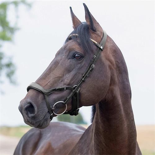 Anatomická uzdečka z měkké kůže a úzkou zdobenou čelenkou.