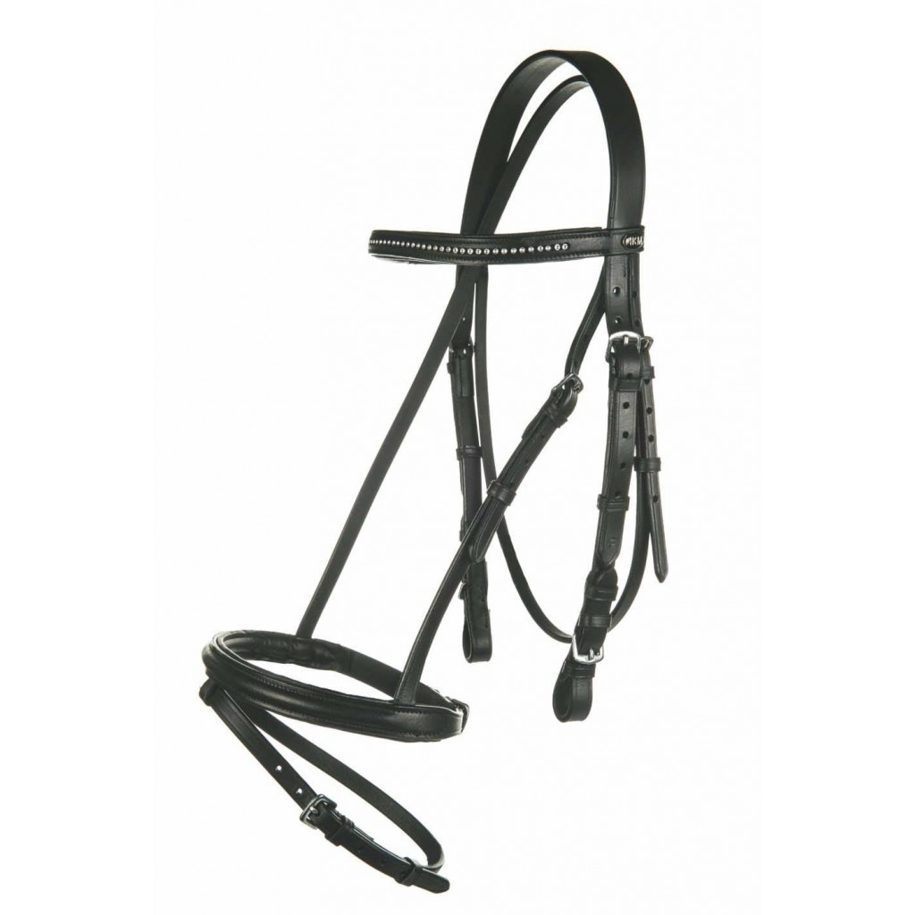 - hovězina - anglický nánosník - kování stříbrné barvy - kožené otěže se zarážkami - osazeno jemnými kameny - bez udidla