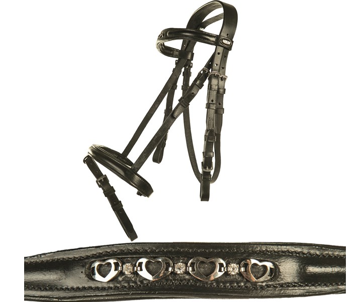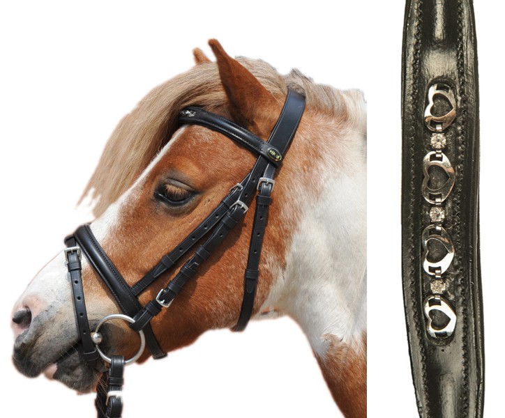 Kvalitní kožená uzdečka s anglickým nánosníkem pro malé poníky. Nánosník a nátylník měkce podloženy, čelenka zdobena srdíčky a syntetickými diamanty. Uzdečka má nerezové kování a tkané otěže s dvojitými zarážkami.