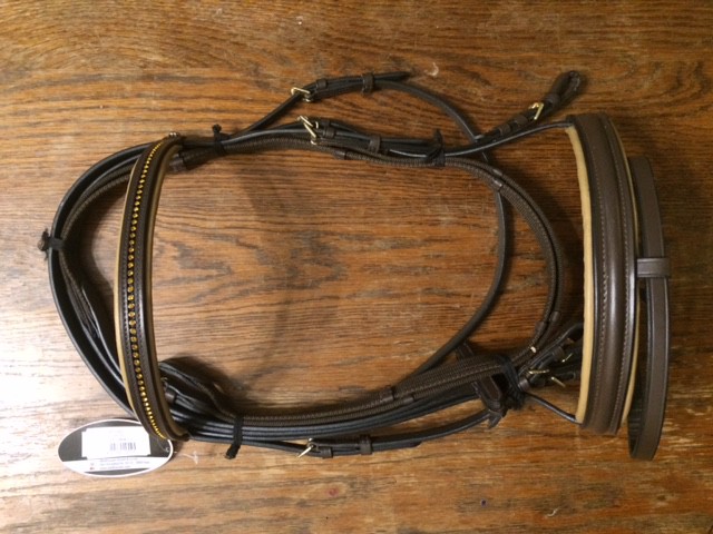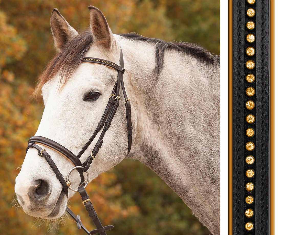Kožená uzdečka s kombinovaným nánosníkem, otěžemi a zdobenou čelenkou. Uzdečka Diamond je vyrobená z pevné, kvalitní a jemné kůže. Má kvalitní kování a čelenku zdobenou kamínky. Nánosník i čelenka jsou polstrované měkkou barvenou kůží. Uzdečka se dodává spolu s plátěnými otěžemi kombinovanými s kůží.