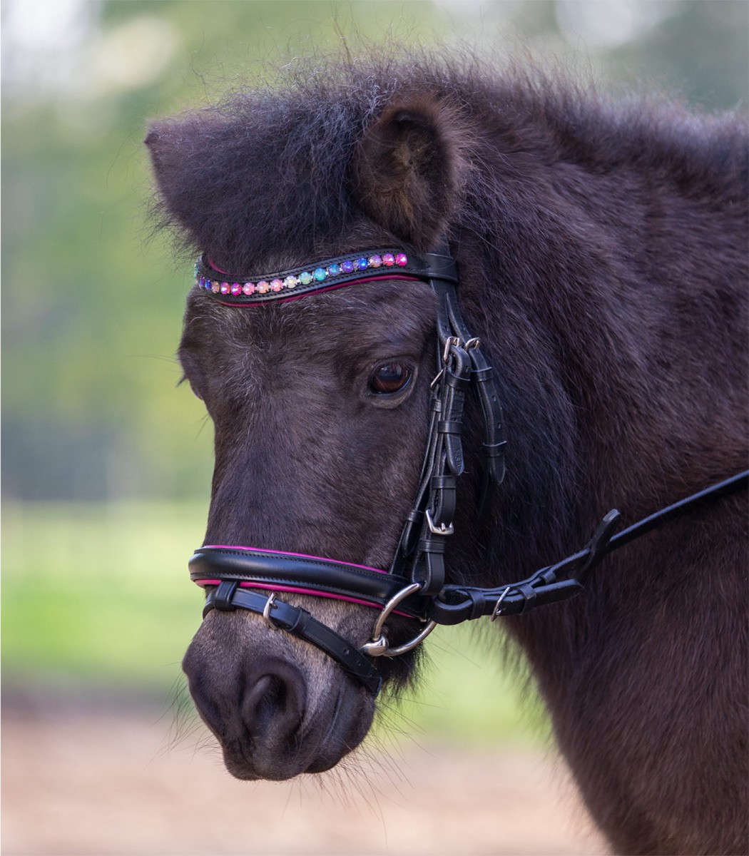 Uzdečka má zdobený nánosník a čelenku s kamínky.