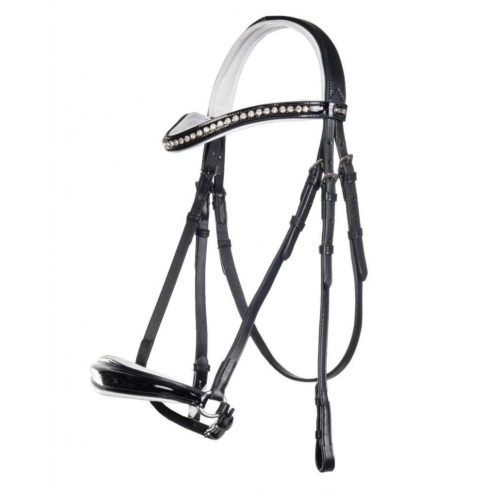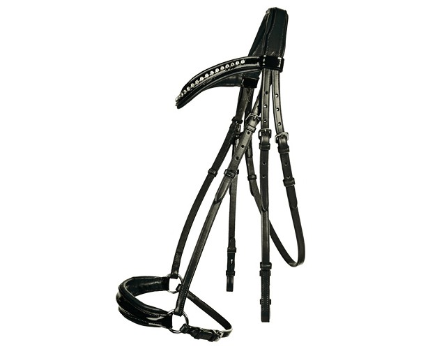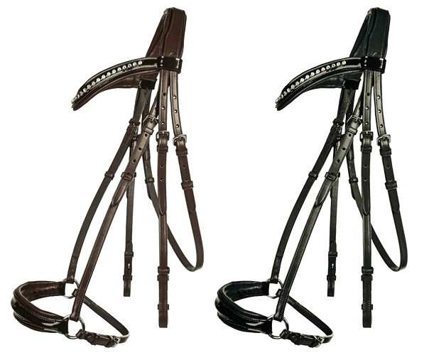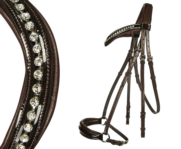 Kožená uzdečka HKM Carolin z prvotřídní hovězí kůže s hannoverským nánosníkem, ozdobnou čelenkou s umělými diamanty a kvalitním stříbrným kováním. Působí velmi reprezentativním dojmem. Má polstrovaný nánosník a nátylník. Čelenka a nánosník jsou z lakované kůže. Uzdečka je dodávána včetně kožených otěží se zarážkami.