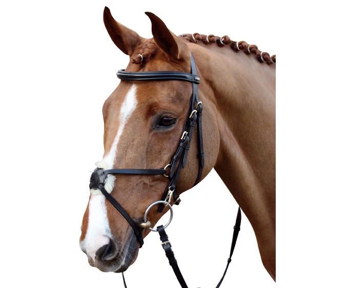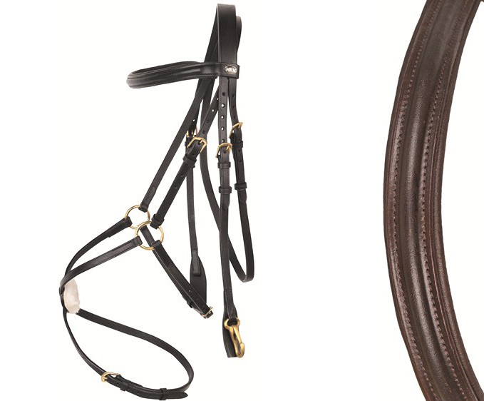 Ručně šitá kožená uzdečka s mexickým nánosníkem, mosazným kováním a lícnicemi s karabinkami pro jednoduchou výměnu udidla. Čelenka je měkce podložena, nánosník je v místě křížení podložen bílým beránkem. Uzdečka je vyrobena z kvalitní měkké kůže. Spolu s uzdečkou jsou dodávány plátěné otěže s dvojitými zarážkami.