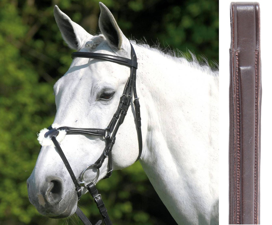 Uzdečka s mexickým nánosníkem, vyrobená z kvalitní měkké kůže. Nátylník, čelenka i nánosník jsou měkce podloženy. Uzdečka je dodávána spolu s 19 mm širokými otěžemi.