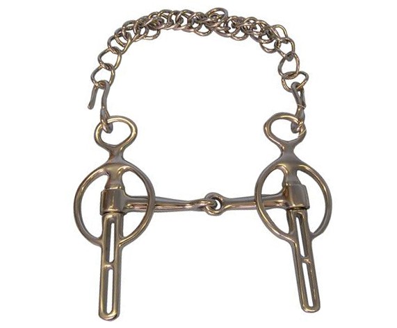 Kočárové pákové udidlo Liverpool s lomeným udítkem. Dodávané s podpínacím řetízkem. V ramenech páky jsou oválné otvory pro zapnutí opratí. Tloušťka udítka je 14mm.