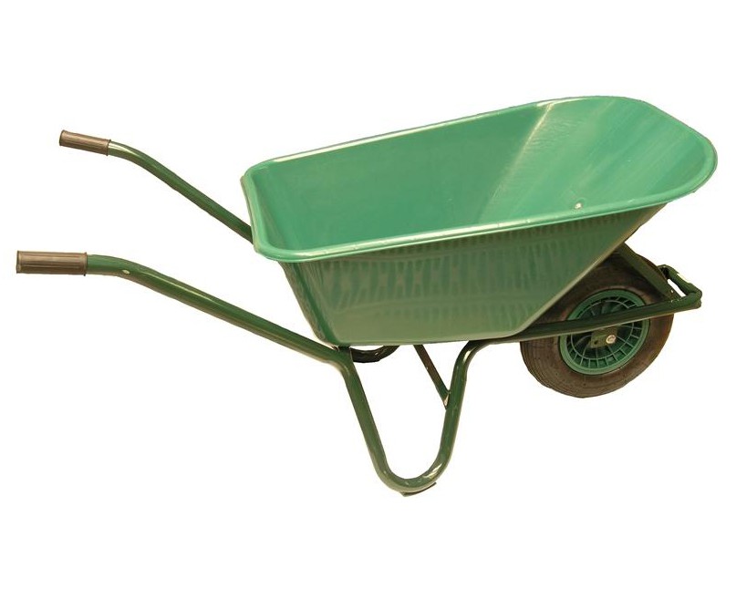 Stavební kolečko s plastovou korbou o objemu 100 litrů. Vhodné na krmivo, ale dá se použít i na hnůj.