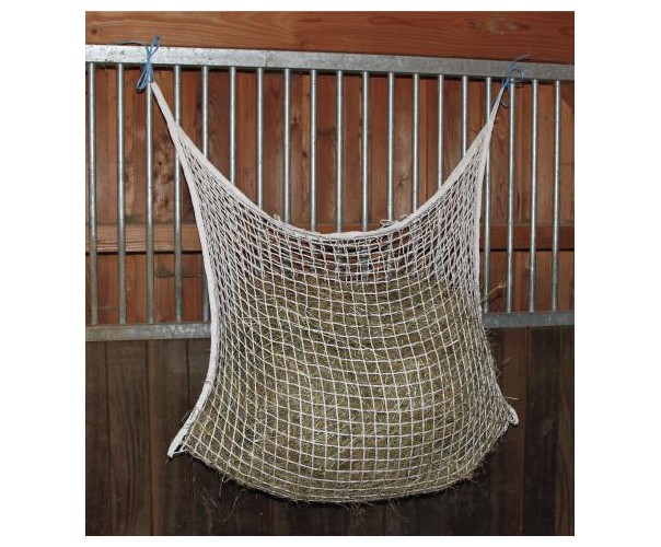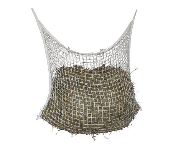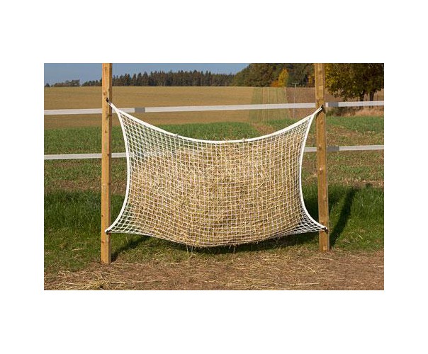 Bílá síť na seno s oky o velikosti 3x3 cm.