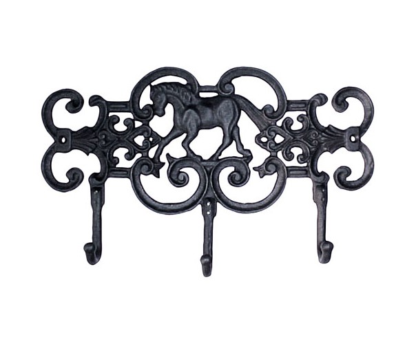 Litinový věšák s motivem koníka k zavěšení ve stáji, sedlovně, šatně nebo kdekoliv jinde. Věšák k zavěšení bund, uzdeček nebo jiného stájového vybavení. Je pevný a unese velkou váhu.