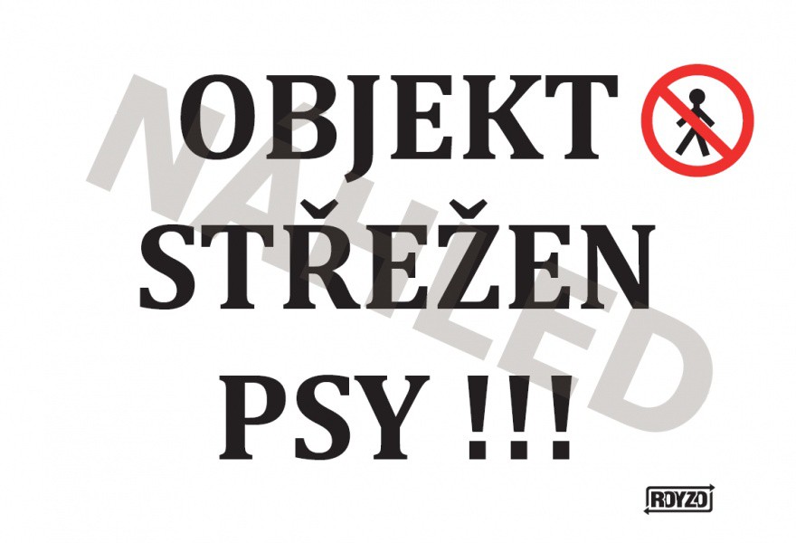 Výstražná tabulka s nápisem OBJEKT STŘEŽEN PSY!!! a s piktogramem zákaz vstupu.