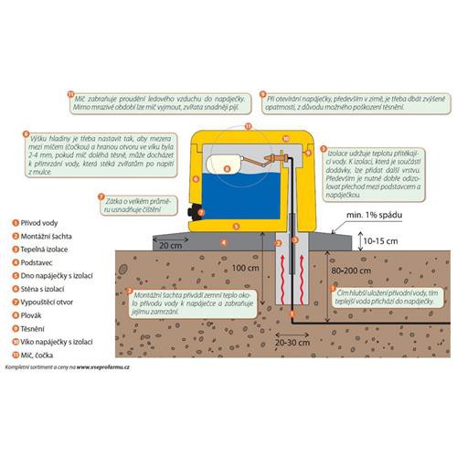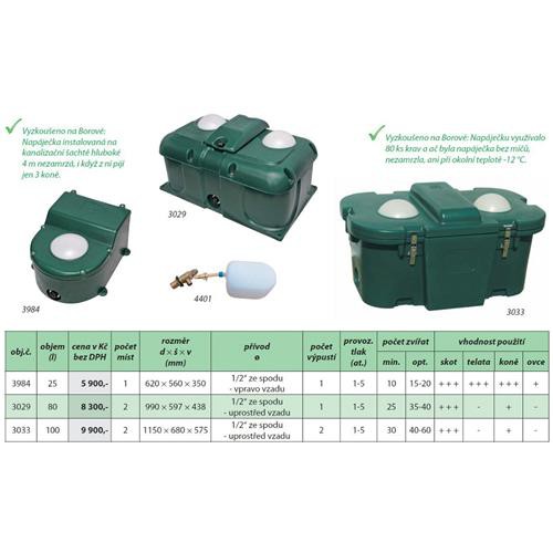 Míčová izolovaná napáječka z polyetylenu, použití v létě i zimě. Míčové napáječky s dvojitou stěnou vyplněnou izolací se používají k napájení koní chovaných pastevních odchovem v zimním období. Pro správný provoz je nutný dostatečný počet zvířat a přívodní potrubí vedenené v dostatečné hloubce tak, aby voda přitékající do napáječky nebyla podchlazená. Míčová napáječka z polyetylenu, izolovaná polyuretanovou pěnou, barva zelená. Vypouštěcí otvor pro snadné čištění. Přívod vody zespoda.