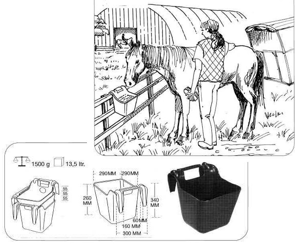 Žlab závěsný mobilní pro koně 13 l je možné používat pouze na vodorovné hrazení boxů. Má 2 závěsné háky a úchyt pro manipulaci. Je vhodný pro přepravní vozíky a pro krmení a napájení při závodech apod.