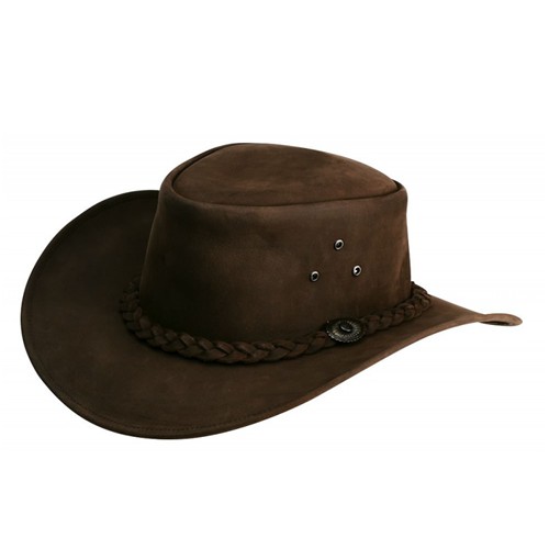 Klobouk z olejované, voděodolné hovězí kůže, větrací otvory. Zdobený černými páskami a pletenou kůží, zdobený sponou.