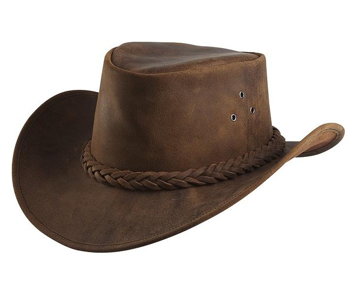 Kožený klobouk z drsněné kravské kůže s větracími otvory a ozdobnou splétanou koženou páskou. Elastická šňůrka. Před použitím ošetřit přípravkem na kůži.