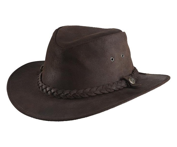 Kožený klobouk s ventilací a ozdobnou splétanou páskou. Elastická šňůrka. Před použitím ošetřit přípravkem na kůži.