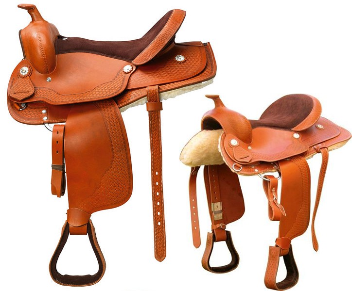 Westernové sedlo z buvolí kůže s laminátovou kostrou typu Rooper a semišem potaženým posedlí.