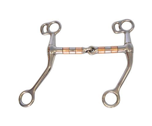 Westernová nerezová lomená páka s udítkem s měděnými rolnami. Měď podporuje slinění a rolny zabraňují "zakousnutí" se koně do udidla - nedávají mu v hubě pevný bod.