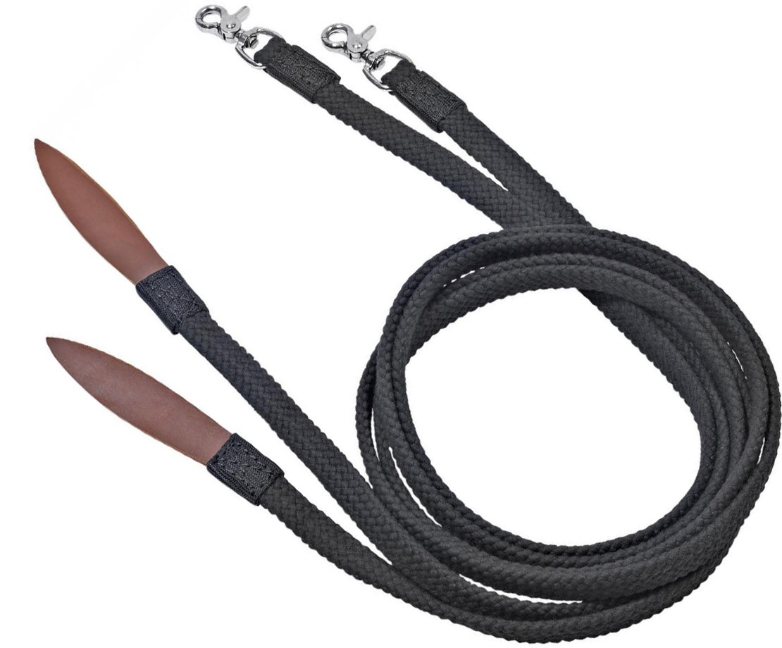 Ploché bavlněné otěže s háčkovými karabinami a koženým švihem na konci.