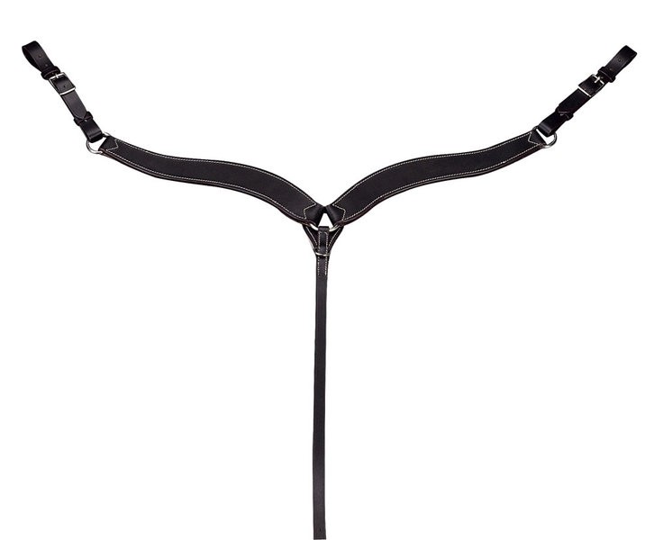 Westernový poprsák v masivnějším provedení z buvolí kůže s bílým prošíváním a poniklovanými přeskami.