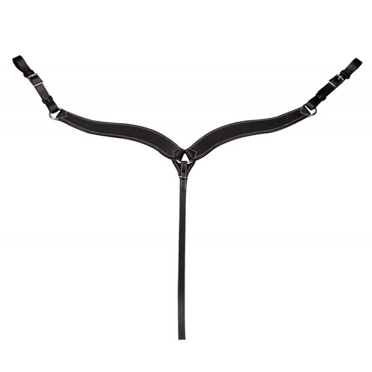 Kožený westernový poprsník značky Equitheme je vyrobený z dvojité hovězí měkké kůže. Na výběr je v černé nebo hnědé barvě a má bílé prošití. Přezky jsou poniklované.