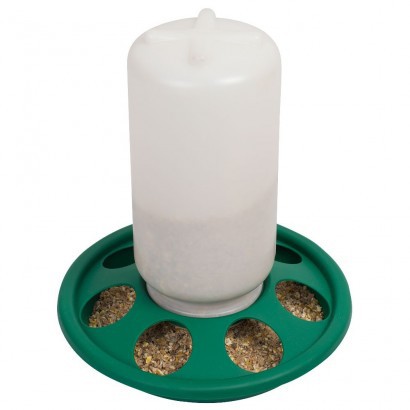 Plastové kruhové krmítko se 7 otvory a zásobní 1litrovou lahví, které je určené k odchovu malých kuřat při zkrmování suchých krmiv. Omezuje vyzhazování krmiva a tím jeho plýtvaní a znehodnocování.