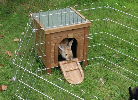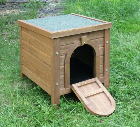 Dřevěné doupě pro venkovní výběh s dvířky, které při otevření slouží jako vlez do doupěte. Má bitumenovou střechu a plastem potaženou podlahu pro snadné čištění. Rozměry: šířka 36cm, hloubka 36cm a výška 40cm. Výběh není součástí dodávky!