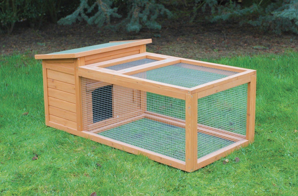 Malá dřevěná králíkárna s výběhem má 1 přední výlezová dvířka, které jsou zasouvací.