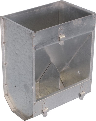 Pozinkované dvojité plechové krmítko pro chov králíků s úchyty na pletivo a bez víka; má rozměry; š - 20cm, h - 12cm a v - 25cm.
