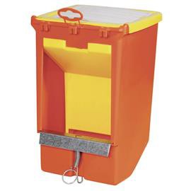 Plastové jednomístné krmítko pro králíky v žlutočerveném provedení o objemu 2 500 ml, které má pozinkované místo proti okusu. Krmítko se zavěsí na klec a doplňuje se z vnější strany klece.